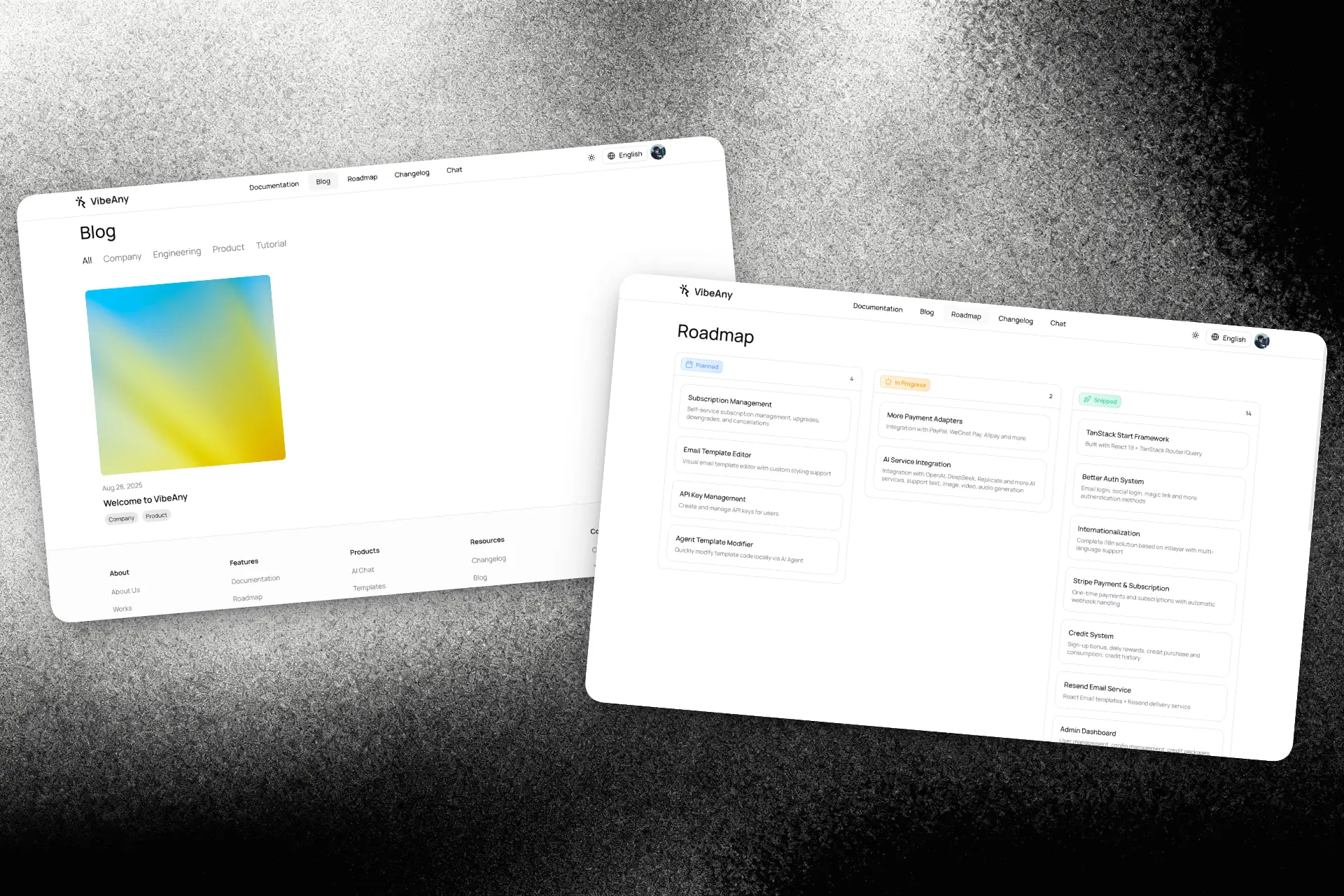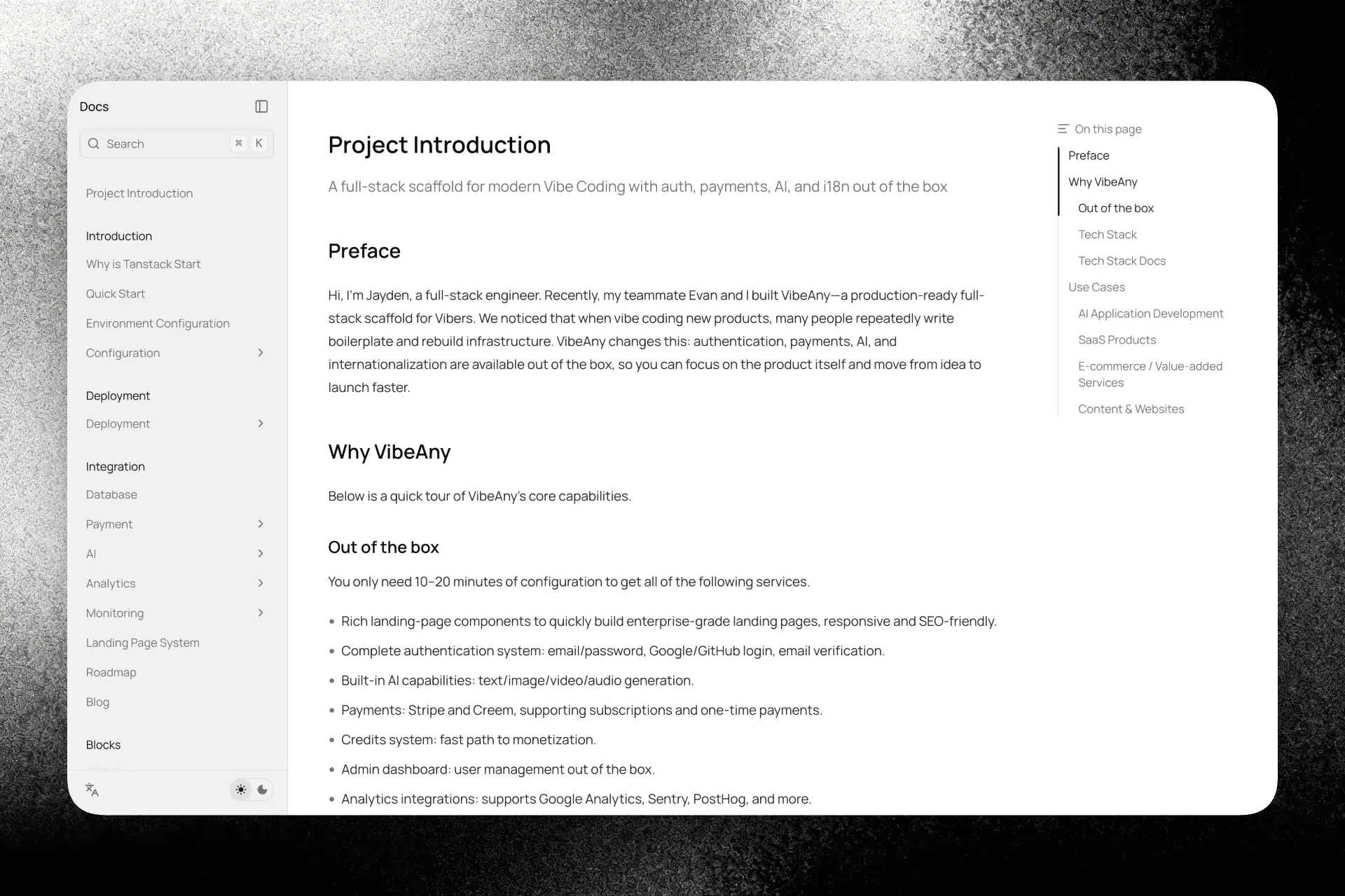 Аутентификация, i18n, платежи, кредиты, ИИ, блог, документация, новостная рассылка, панель управления, маршрутизация и SEO уже встроены — это экономит вам недели разработки.