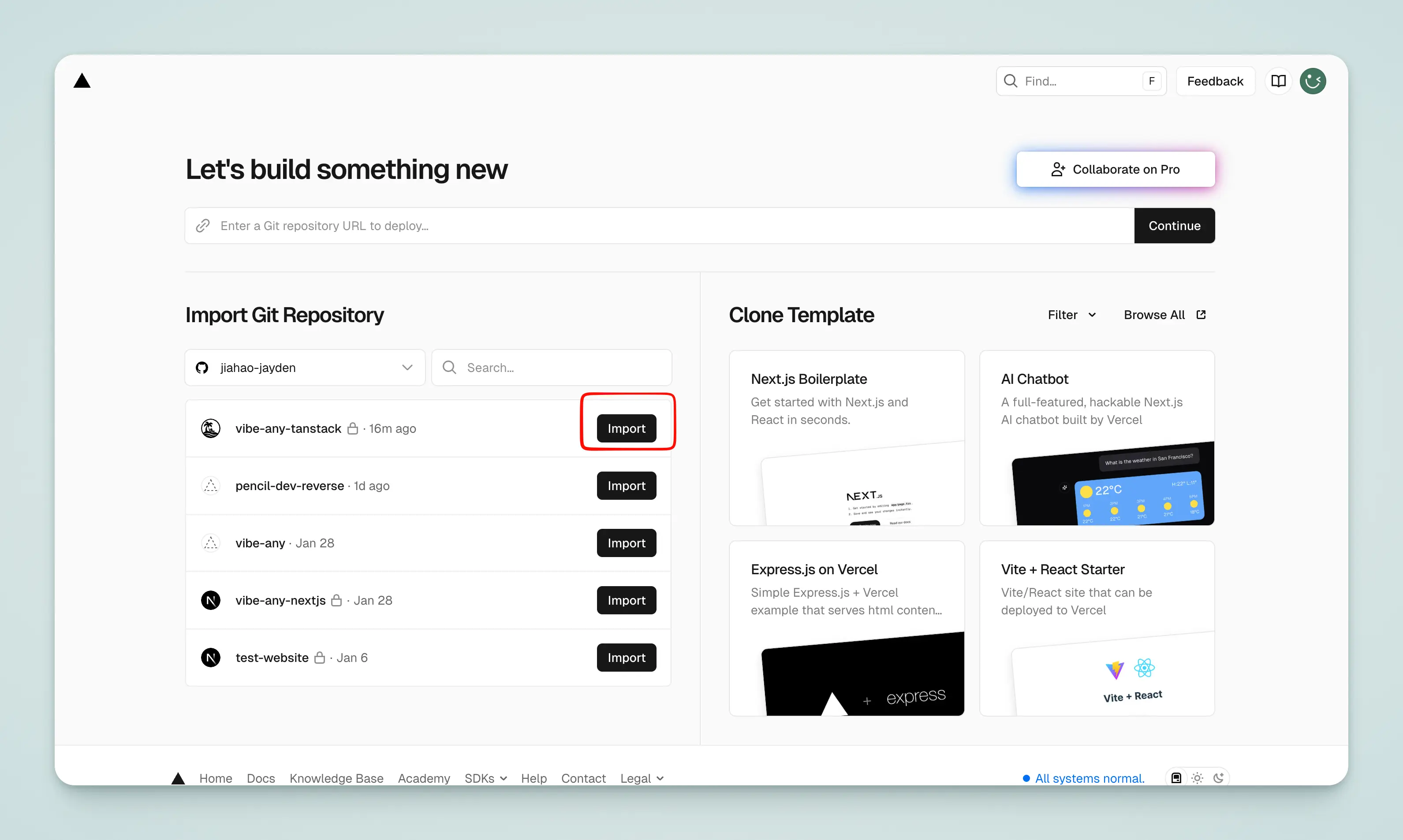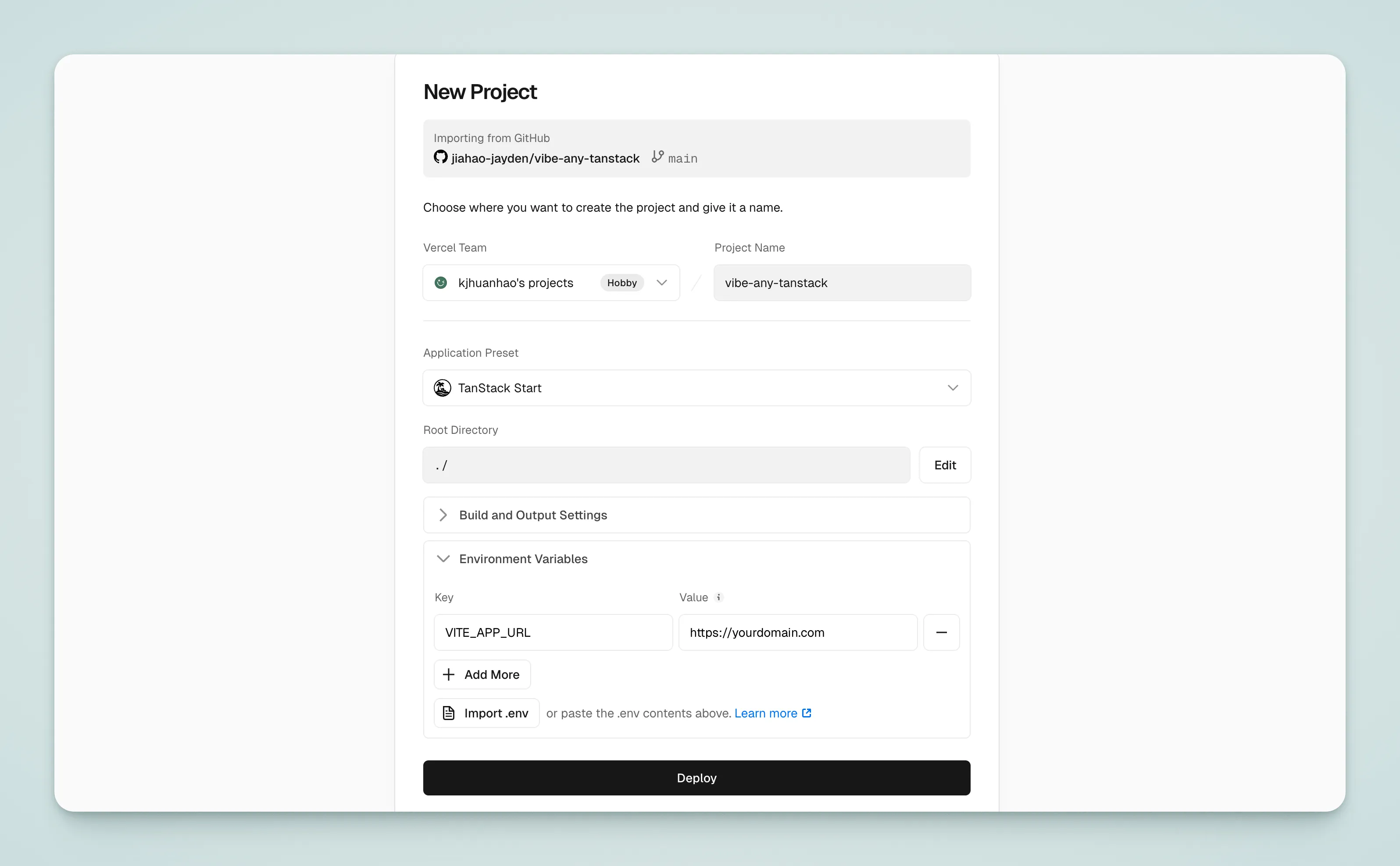 Откройте Vercel, нажмите Import и выберите репозиторий.