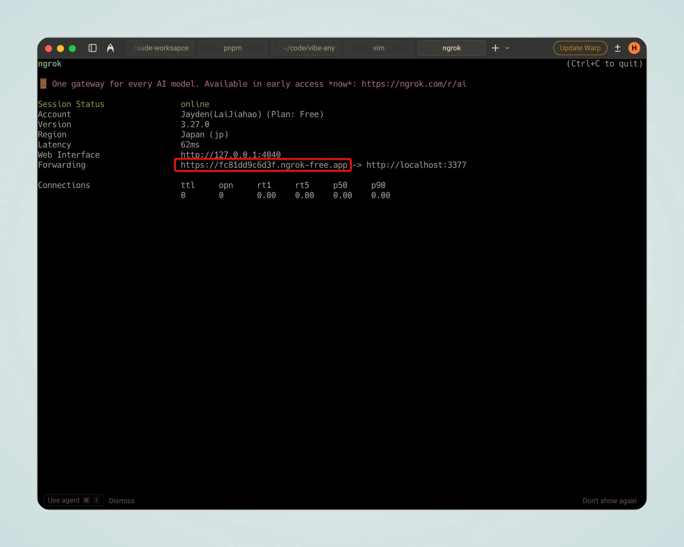 ngrok http 3377Скопируйте публичный адрес из вывода терминала