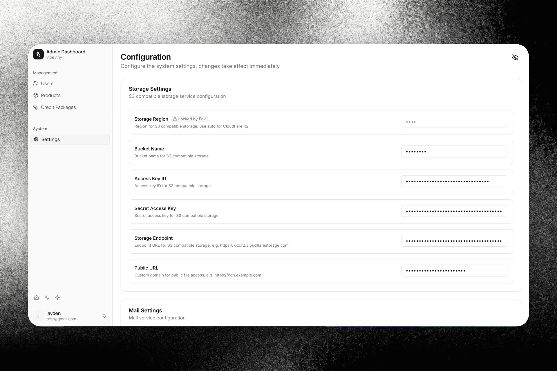 Редактируйте настройки платежей, email, хранилища и ИИ через удобный интерфейс